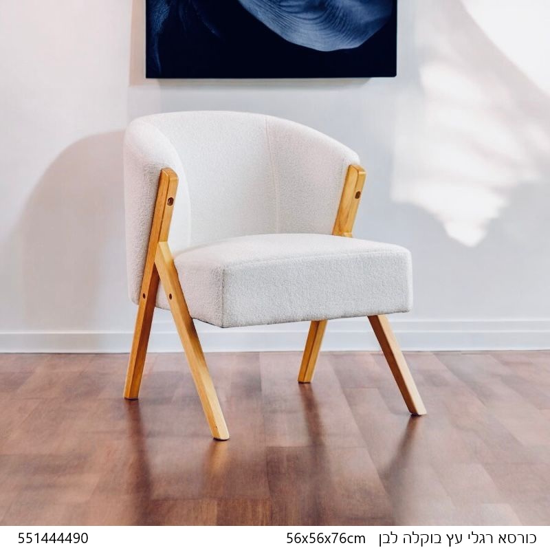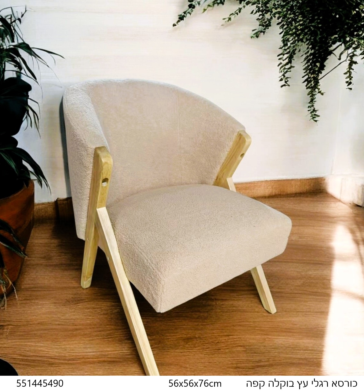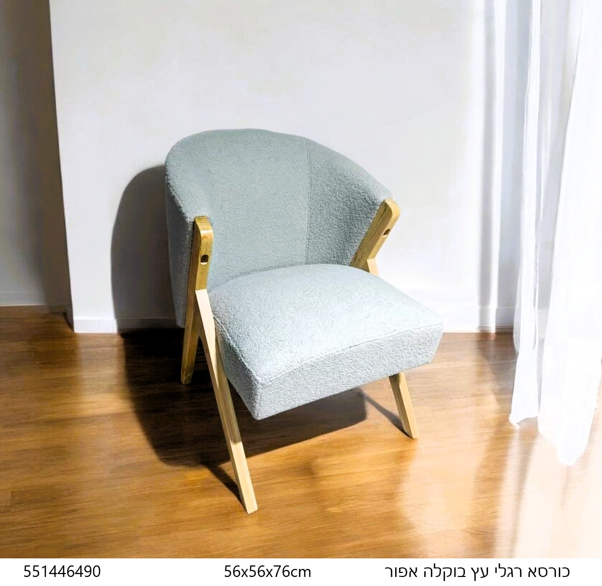 כורסא מעוצבת בגודל קומפקטי עם מושב ומשענת מרופדים בבד בוקלה איכותי, ורגלי עץ טבעיות המוסיפות חמימות וסטייל לחלל.