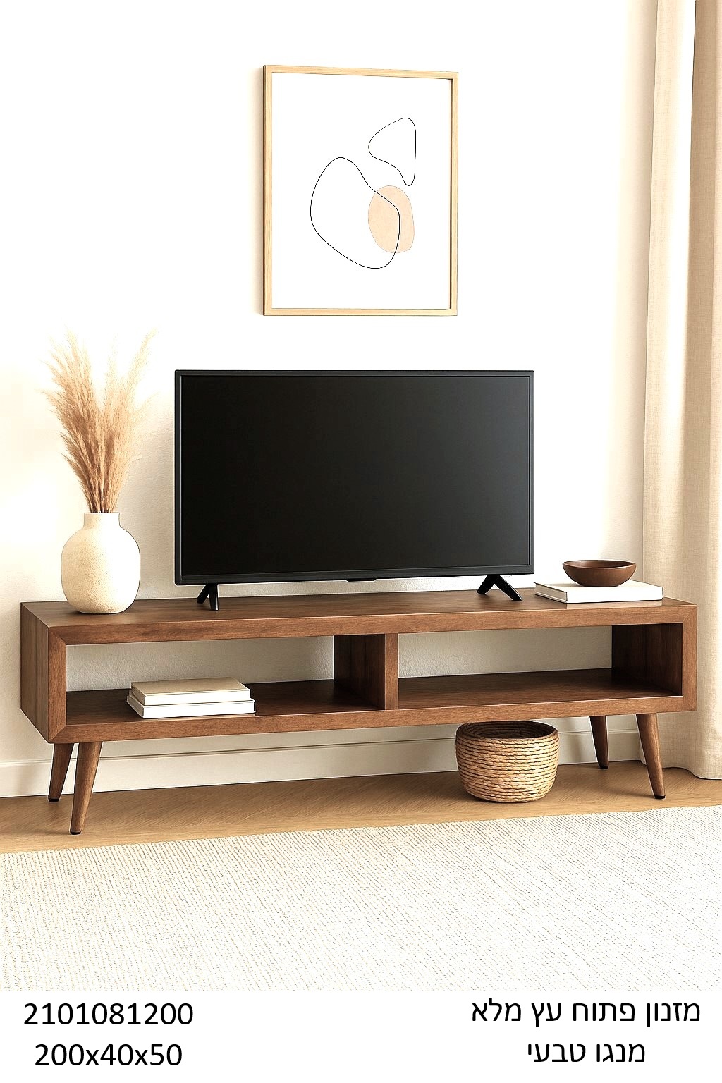 מזנון פתוח מעץ מנגו מלא בגוון טבעי – הבסיס המושלם לפינת הטלוויזיה שלך, שמשלב פונקציונליות עם עיצוב חמים וטבעי.