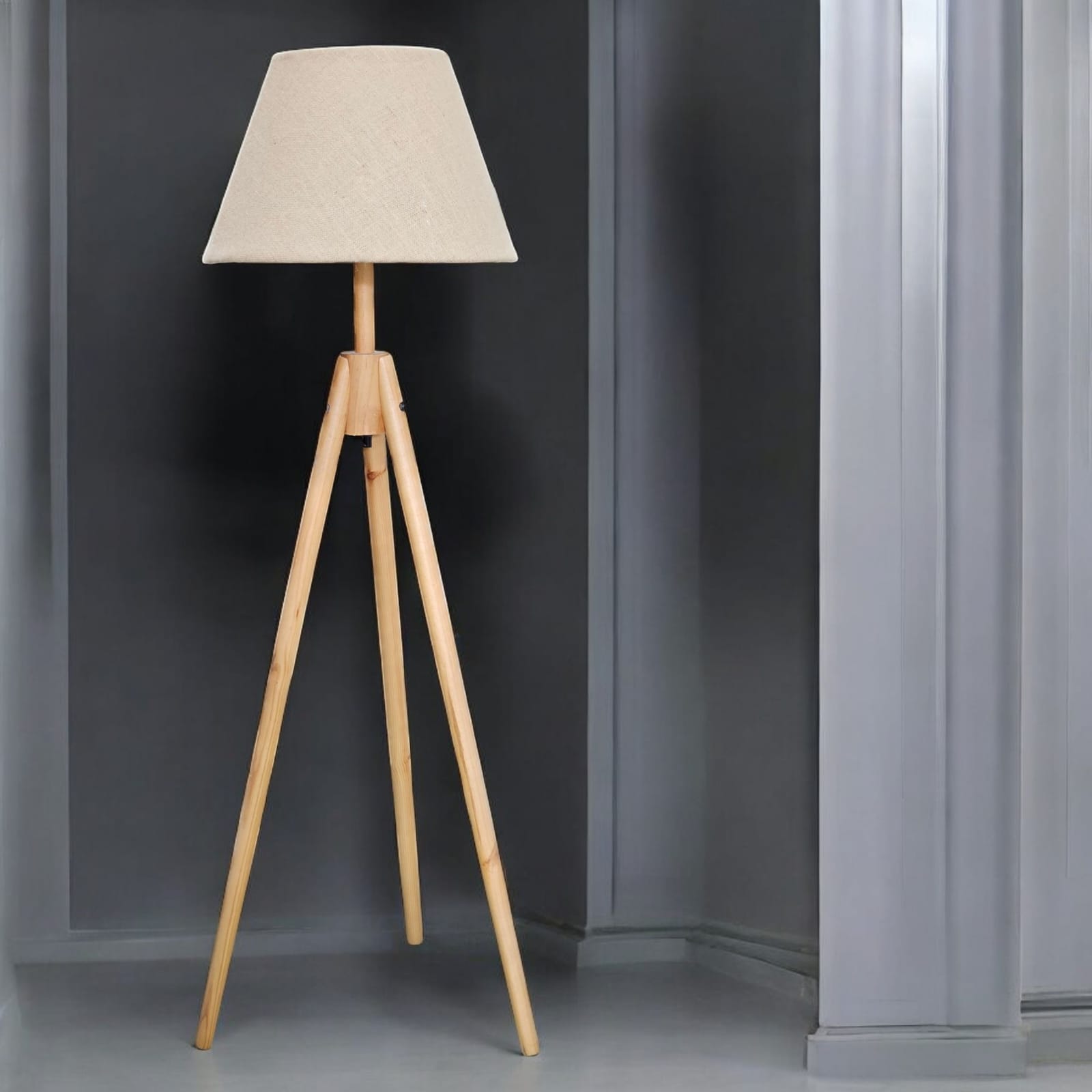 מנורת רצפה דקורטיבית בעיצוב סקנדינבי נקי, משלבת בסיס עץ טבעי בצורת חצובה עם אהיל בד קנבס בהיר.