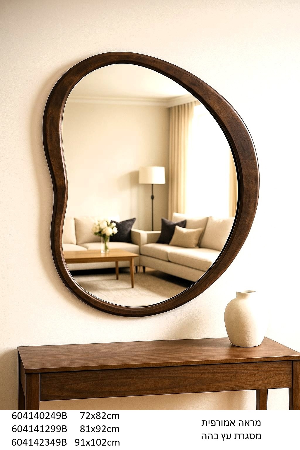 מראה אמורפית בעיצוב מודרני וזורם, בעלת מסגרת עץ כהה איכותית בגוון חם וטבעי. הצורה האורגנית הלא־סימטרית יוצרת מראה אמנותי ואלגנטי, ומשתלבת באופן מושלם מעל קונסולה, בסלון, בחדר שינה או בחלל כניסה. גימור העץ הכהה מעניק תחושת יוקרה ורוגע, והמראה זמינה בשלושה גדלים – 72×82, 81×92, ו־91×102 – להתאמה מדויקת לכל סוג חלל.