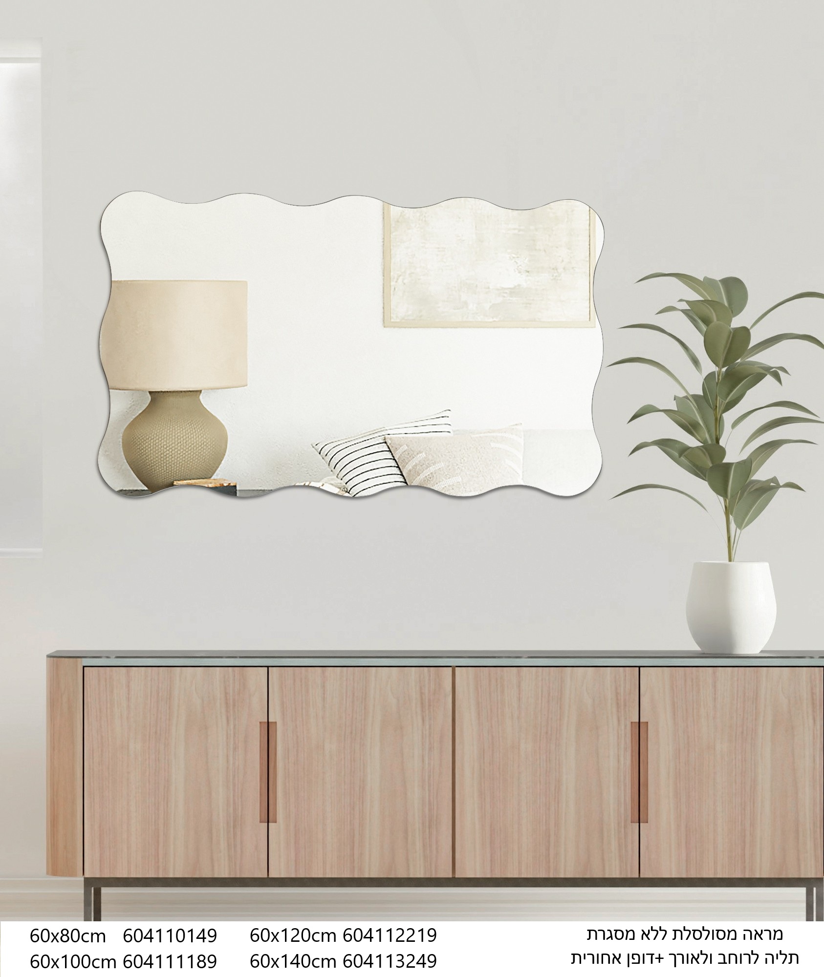 מראה מעוצבת עם קווים גליים רכים, ללא מסגרת, שיוצרת מראה מודרני ואומנותי לחלל הבית.