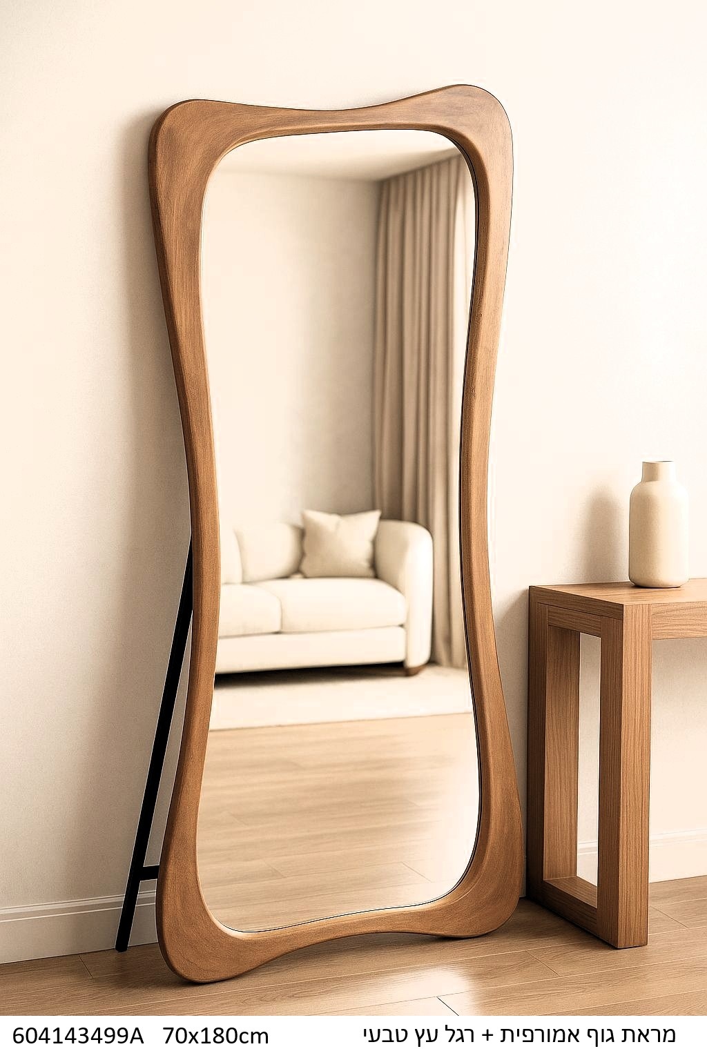 מראת גוף גדולה בעיצוב אמורפי יוקרתי, עם מסגרת עץ טבעי בגוון חם ורך המתאימה לכל חלל מודרני או מינימליסטי. צורתה הייחודית בעלת הקווים הזורמים יוצרת תחושת תנועה ואלגנטיות, והרגל האחורית מאפשרת הצבה עצמאית ונוחה בחדר שינה, בחדר ארונות, בסלון או בחלל כניסה. בגודל מרשים של 70×180 ס״מ, המראה מעניקה תחושת מרחב והגדלת חלל.