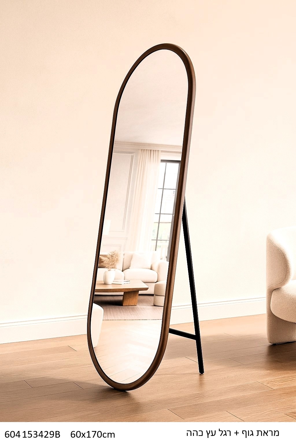 מראת גוף יוקרתית בעיצוב מודרני ומעודן, בעלת מסגרת עץ איכותית בגוון חם ורגל אחורית חזקה המאפשרת הצבה חופשית בכל מקום בבית. הצורה המעוגלת עם קשת עליונה מעניקה תחושת רכות וזרימה, ומשתלבת בצורה מושלמת עם עיצוב מינימליסטי, סקנדינבי או מודרני. הגודל 60×170 ס״מ מתאים למדידות גוף מלאות וליצירת תחושת מרחב גדולה יותר בחדר.
