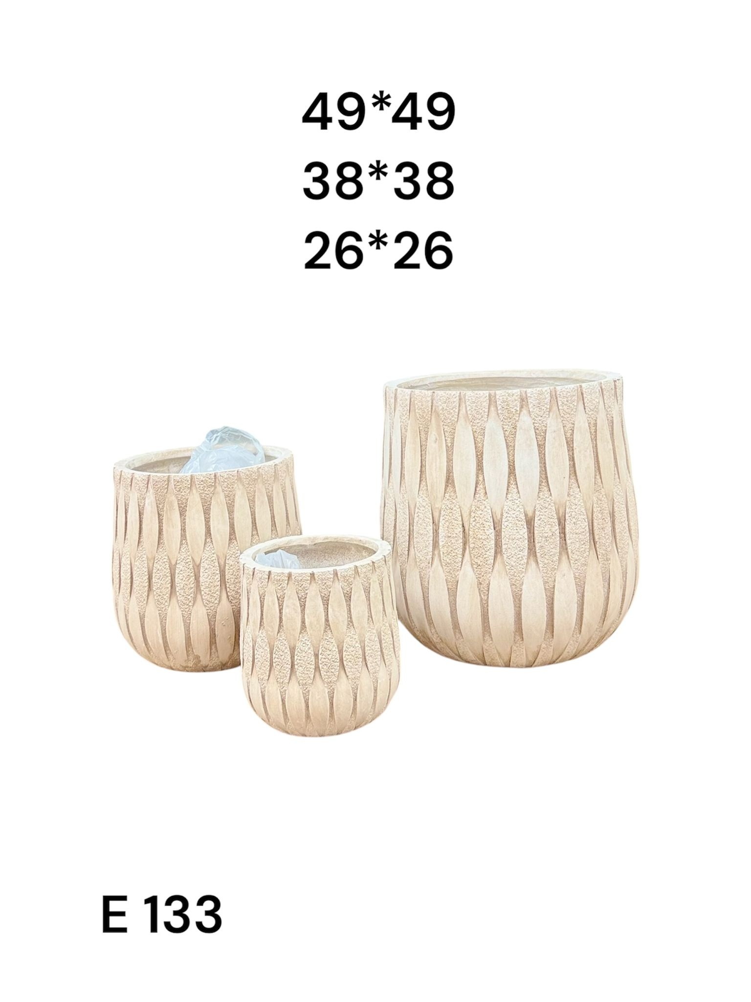 סט מהמם של שלושה עציצים בגוון בז' טבעי, עם חריטות דקורטיביות שמוסיפות מרקם ועומק מיוחד. מושלם ליצירת מראה חמים וטבעי בבית, במרפסת או בגינה.