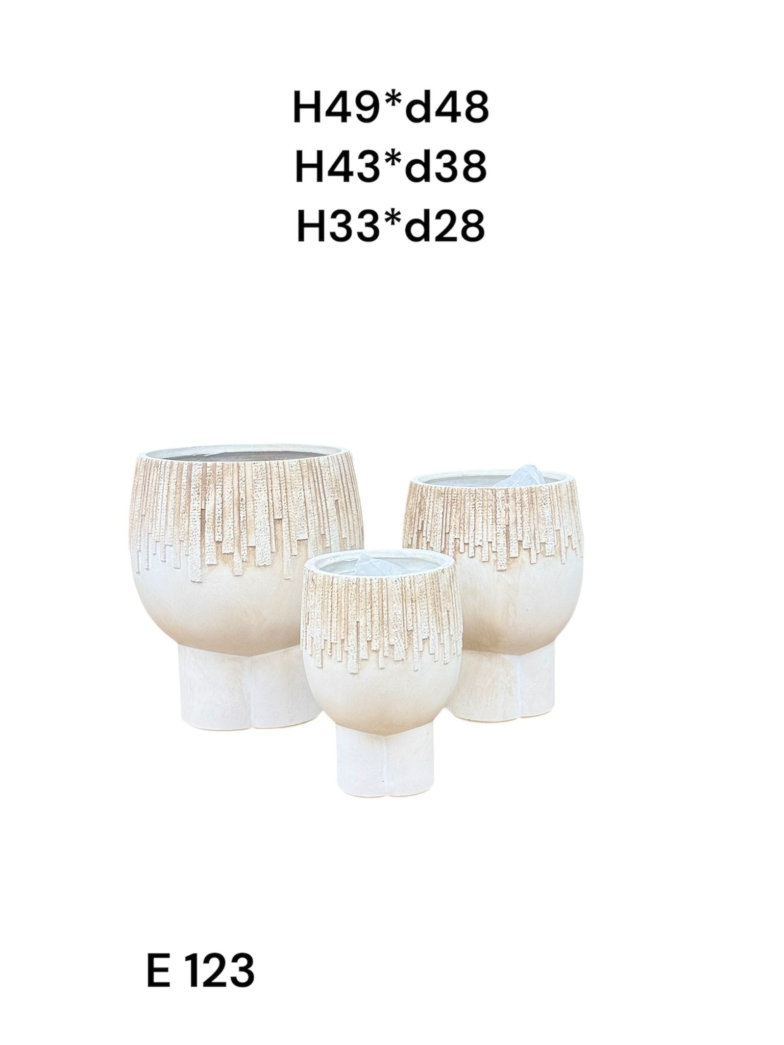 סט אלגנטי של שלושה עציצים בגוון שמנת עם דוגמאות טקסטורה עליונה שמשדרות ייחודיות ויוקרה. כל עציץ עומד על רגליים קטנות שמוסיפות לו גובה ואופי מיוחד, ומדגישות את הצמח שבתוכו.