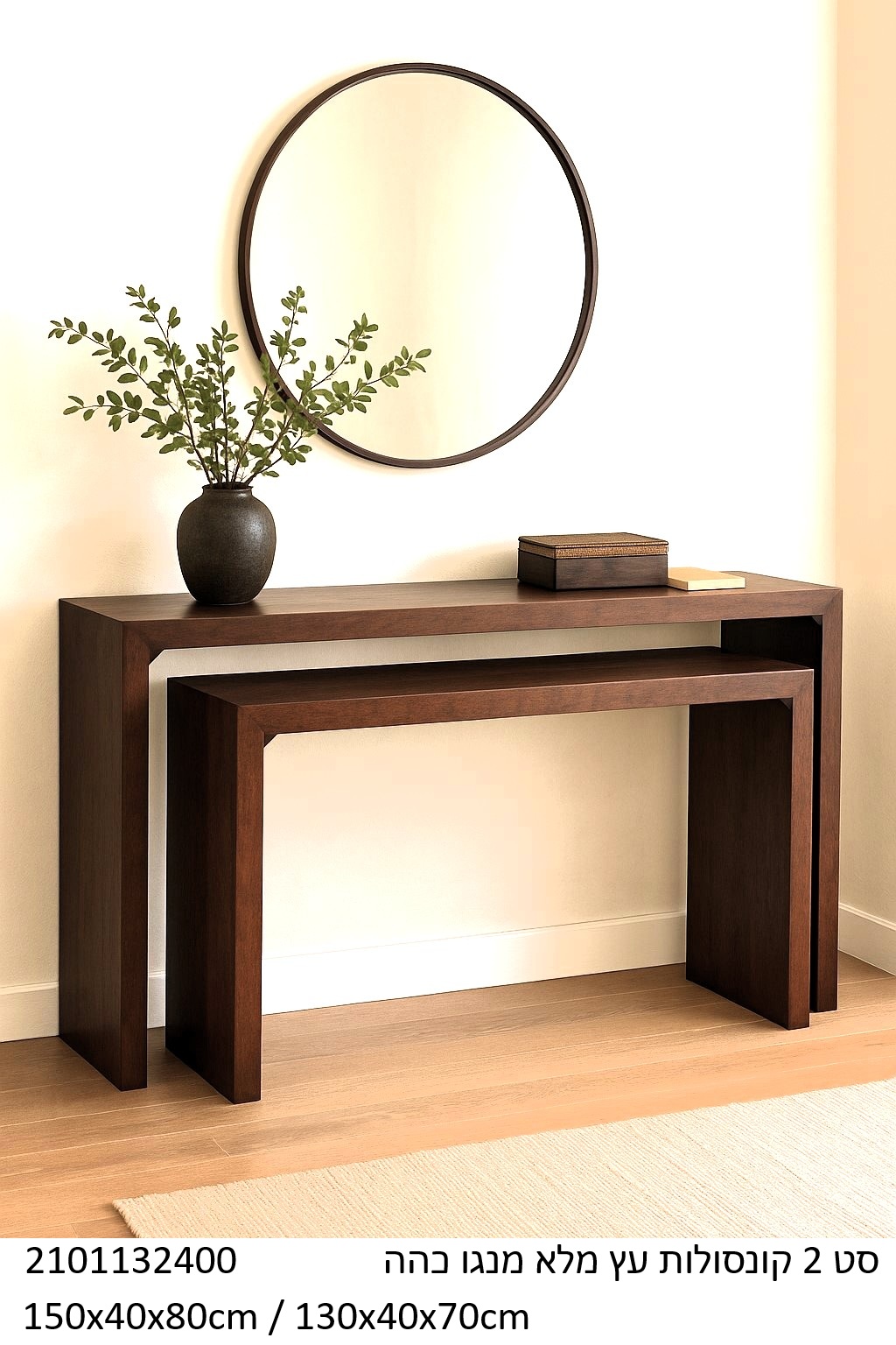 סט קונסולות במידות שונות, עשויות עץ מנגו מלא בגוון חום כהה עמוק שמוסיף חמימות ותחכום לכל חלל. העיצוב המינימליסטי עם קווים ישרים וחדים הופך את הסט לבחירה מושלמת לכניסה, למסדרון או לסלון מודרני.