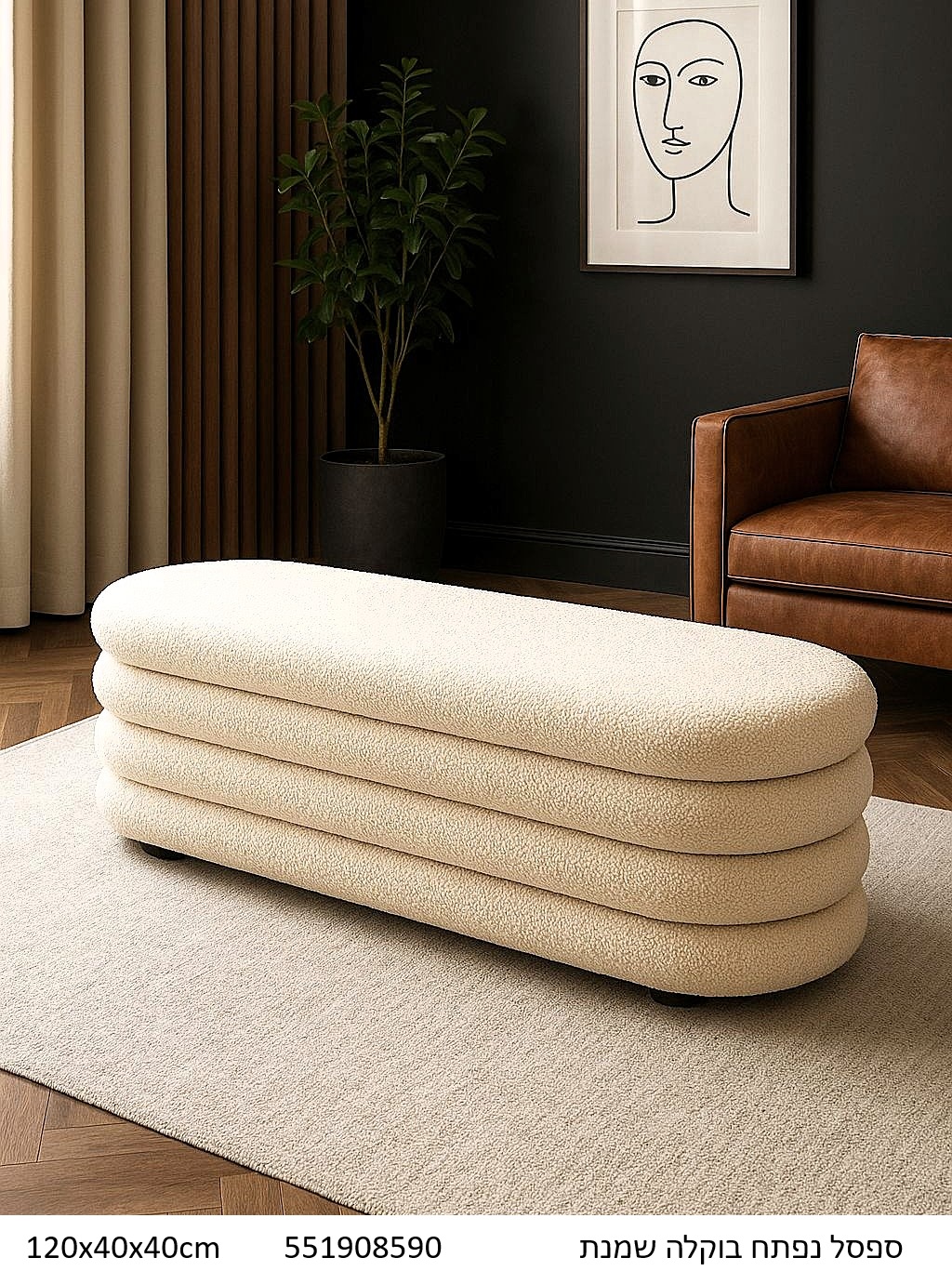 הספסל המודרני שלנו בעיצוב ייחודי עם בד בוקלה לבן יוקרתי, מתאים לכל חלל – סלון, חדר שינה או פינת המתנה.