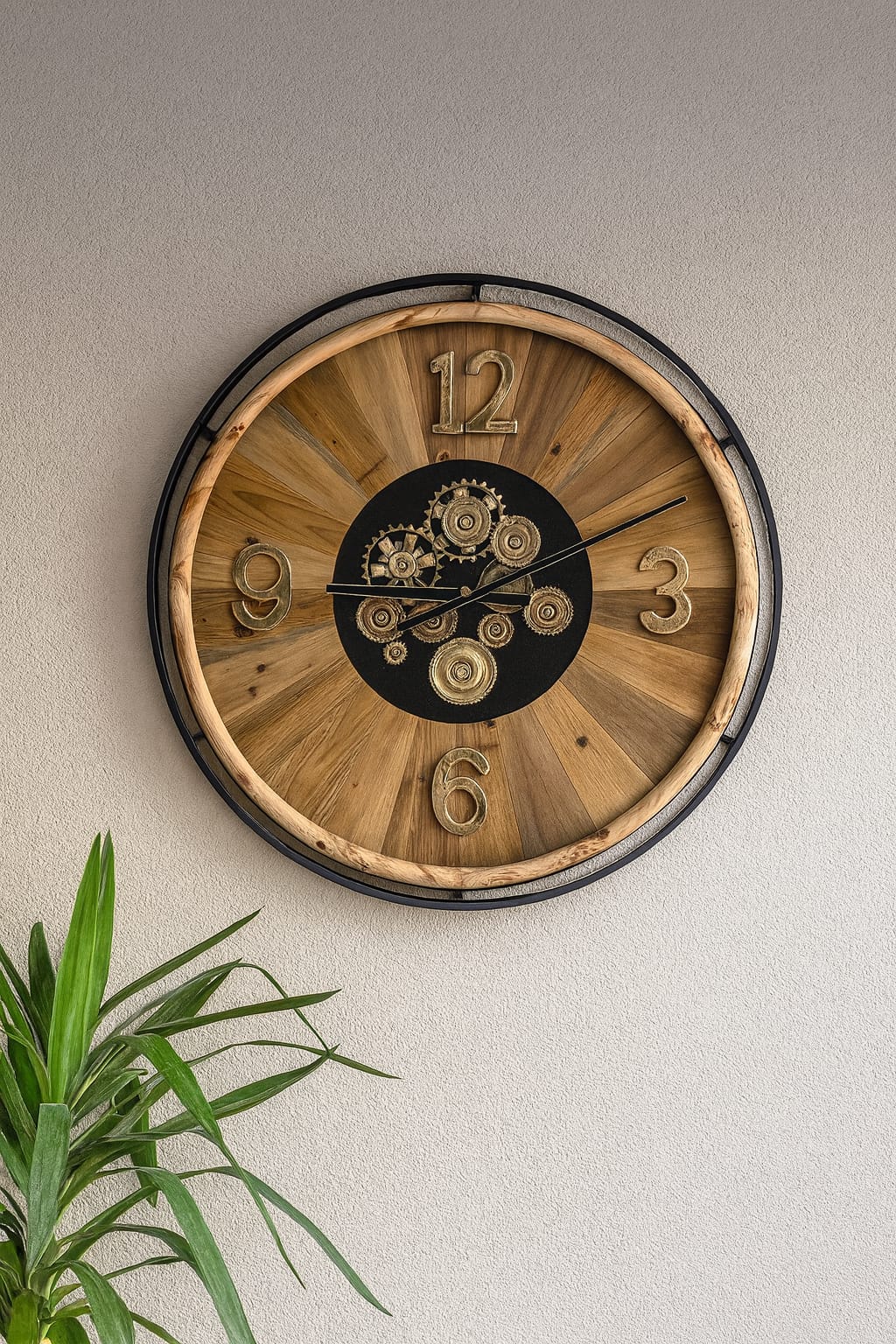 שעון קיר ייחודי בעיצוב תעשייתי יוקרתי, עשוי מעץ טבעי בגוונים חמים עם גלגלי שיניים דקורטיביים במרכז. שילוב מושלם של עץ ומתכת המוסיף עומק, סטייל ואופי לכל חלל. מתאים לסלון, לפינת אוכל, למשרד או לחלל כניסה. איכות גבוהה, עמידות לאורך זמן ומראה שמשדרג את הבית בקלות.