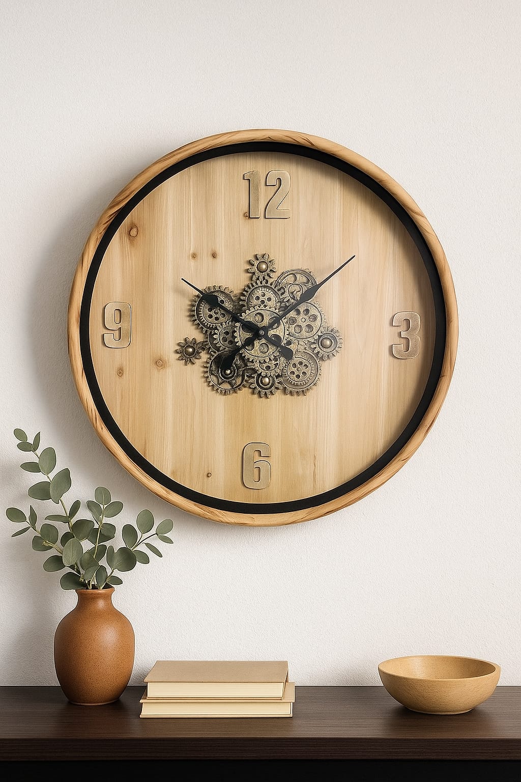 שעון קיר ייחודי בעיצוב תעשייתי מודרני, עשוי מעץ טבעי בגוון חמים ומרכז גלגלי שיניים מרשים. מתאים לסלון, למשרד, לפינת אוכל או לחלל כניסה. איכות גבוהה, עמידות מצוינת ומראה שמשדרג כל חלל בקלות. פריט דקורטיבי ופונקציונלי שמוסיף אופי ויוקרה לבית.